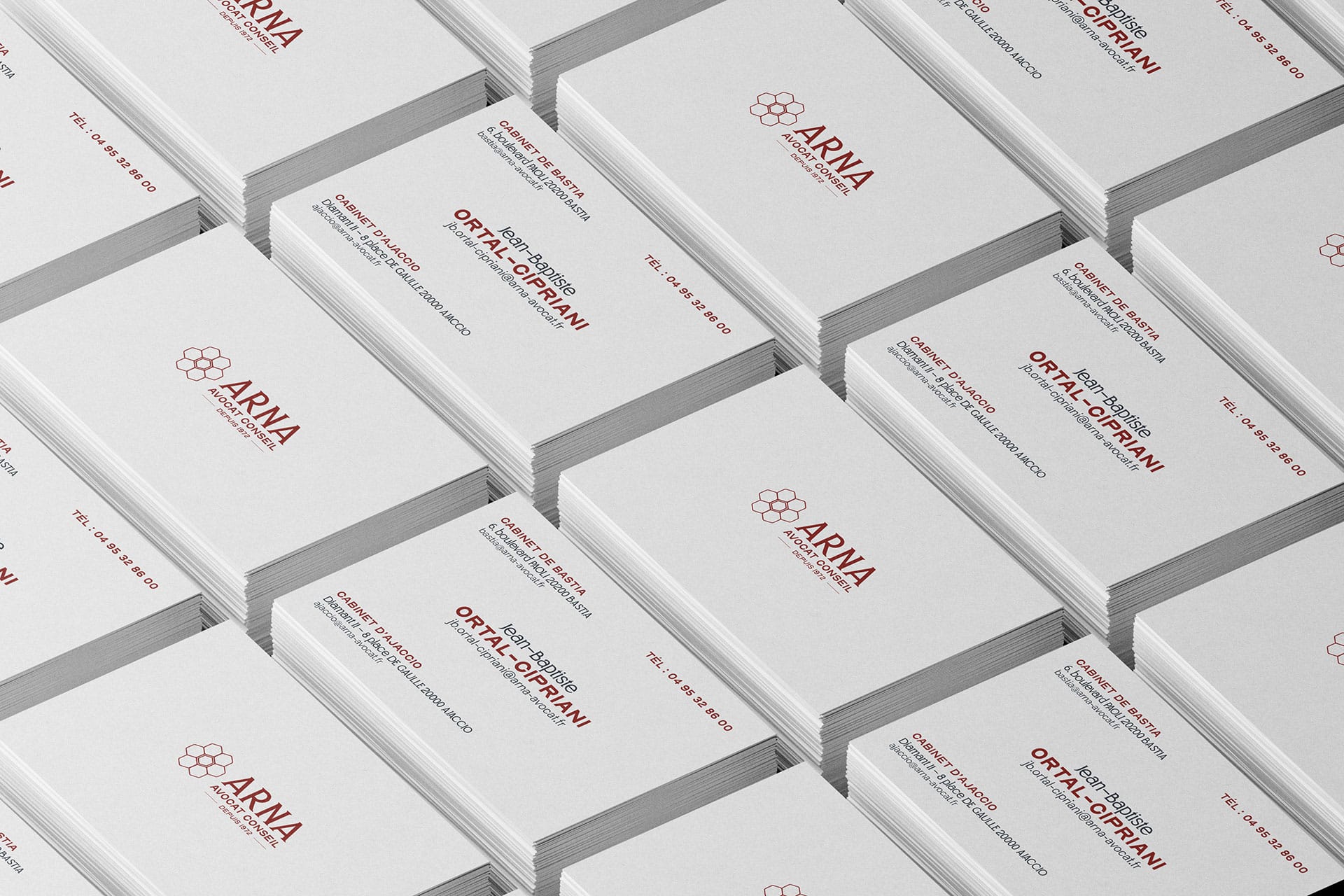- Définition de l'architecture de marque : le cabinet souhaite un logo inspiré d'une structure de ruche (« Arna » en Corse) - symbole de travail collectif, de structure, d'organisation et de dynamique - avec une notion de relief pour apporter modernité et dimension.