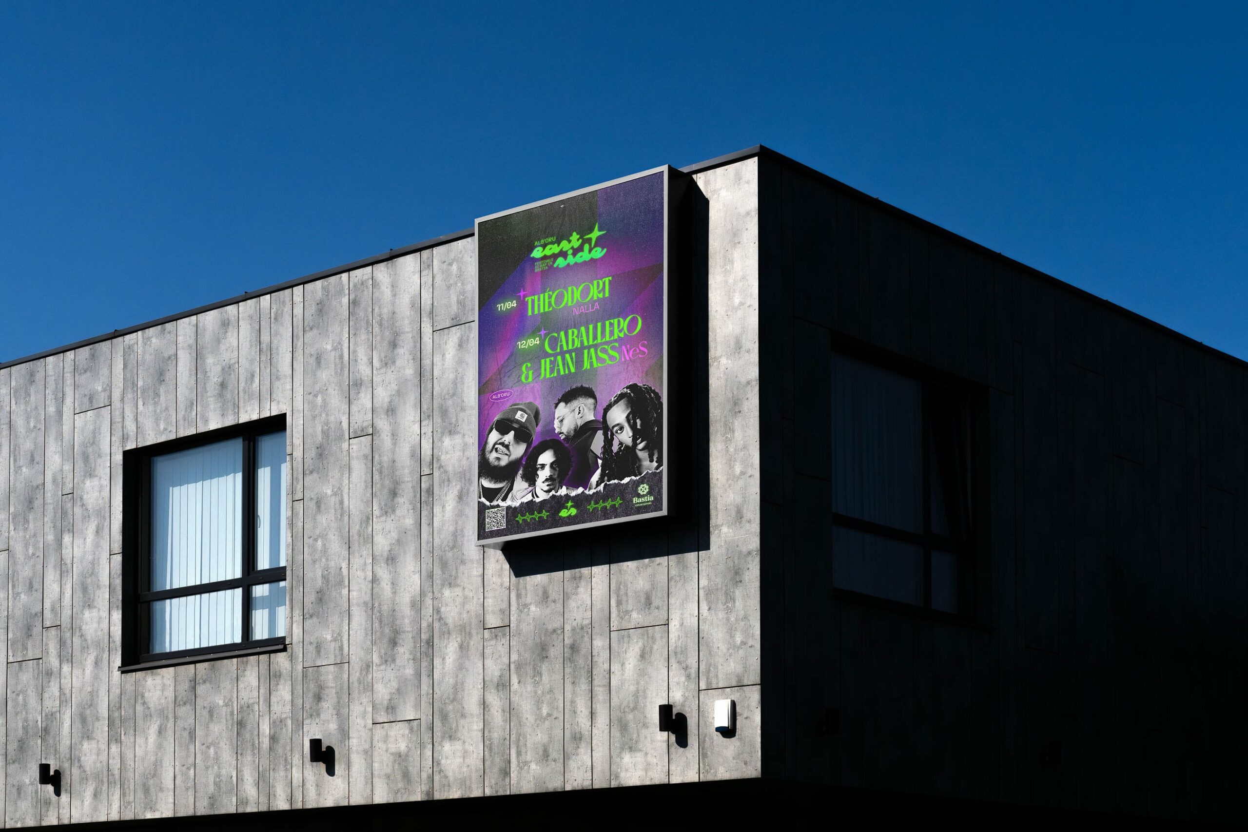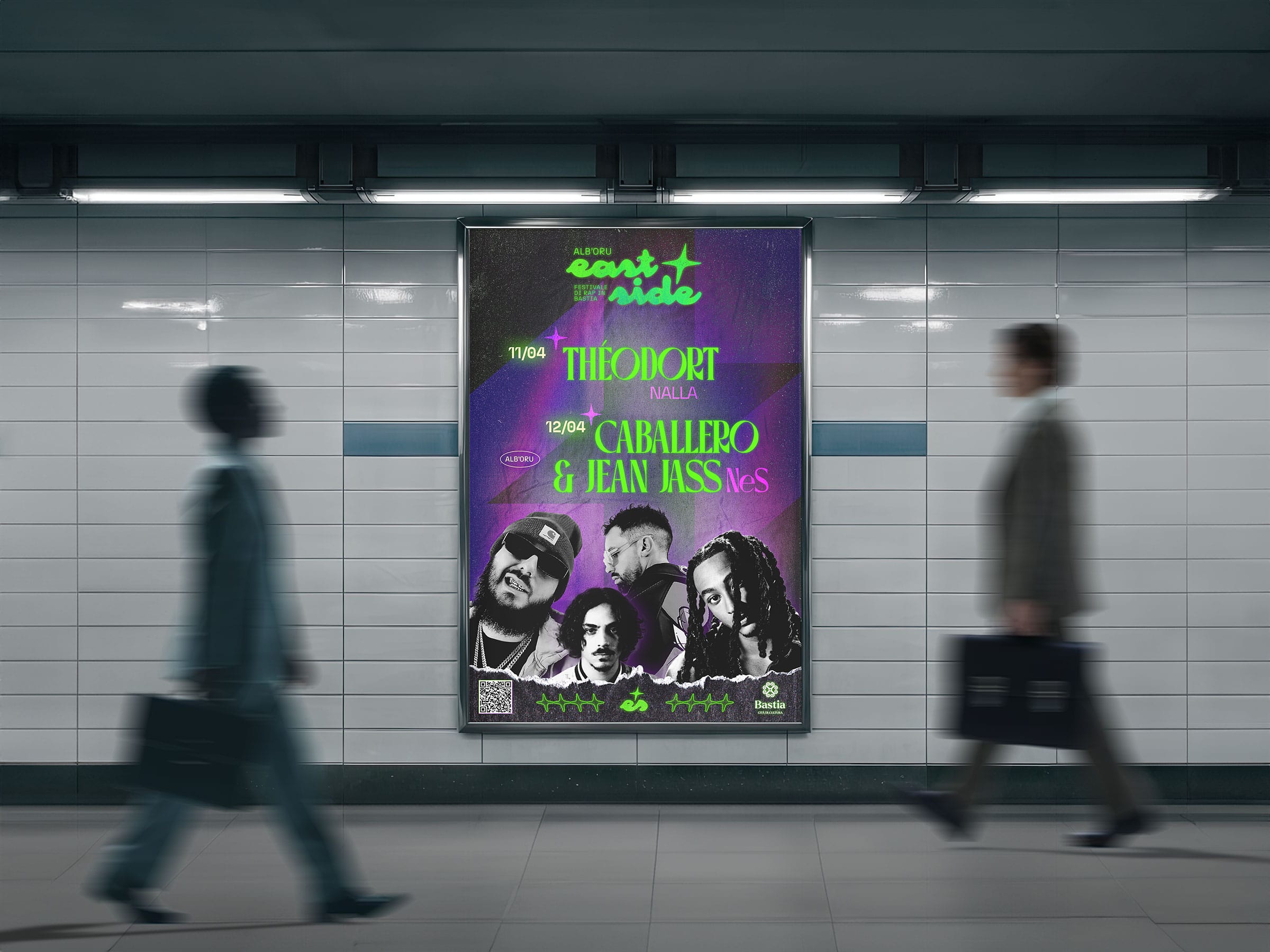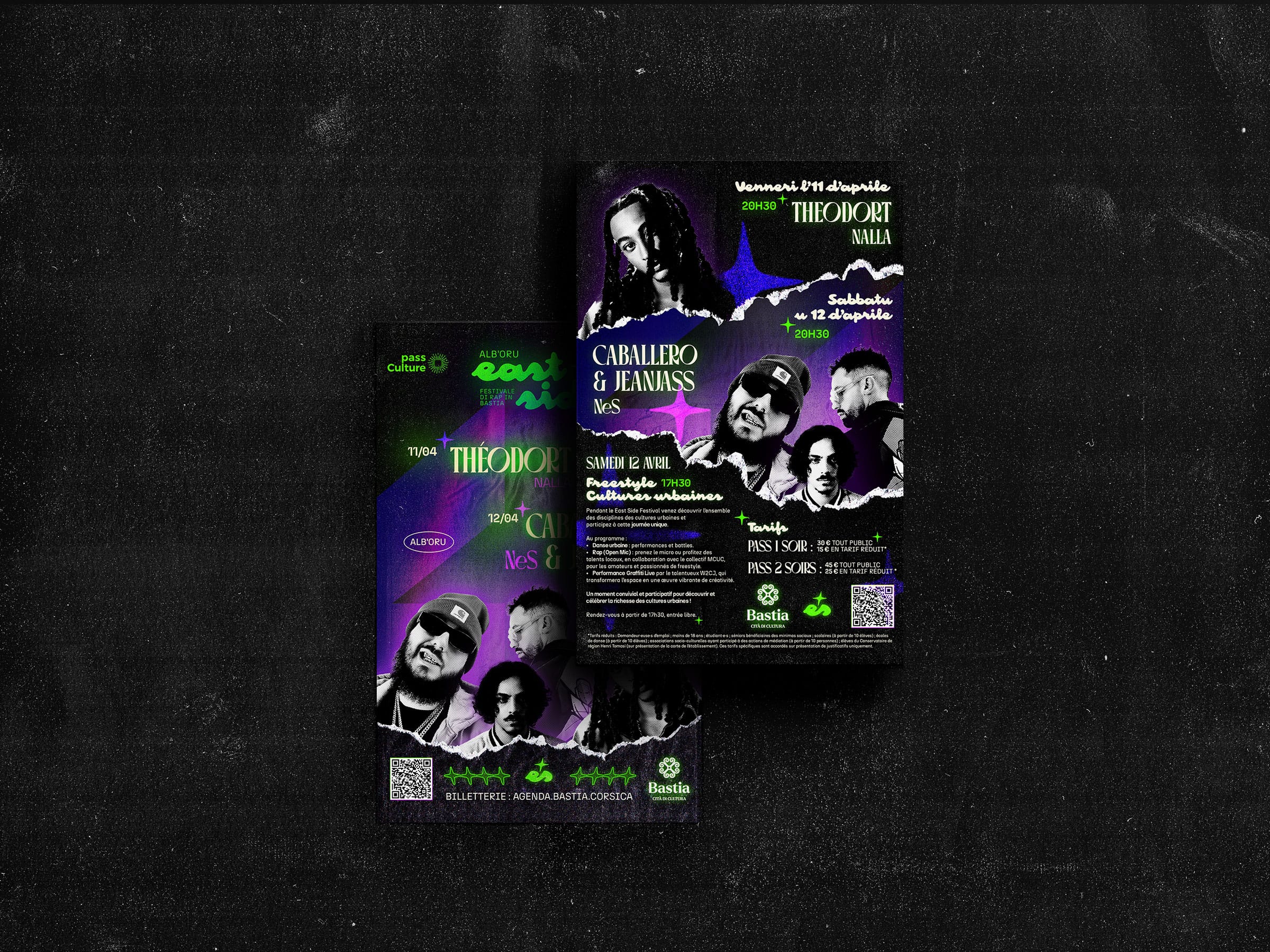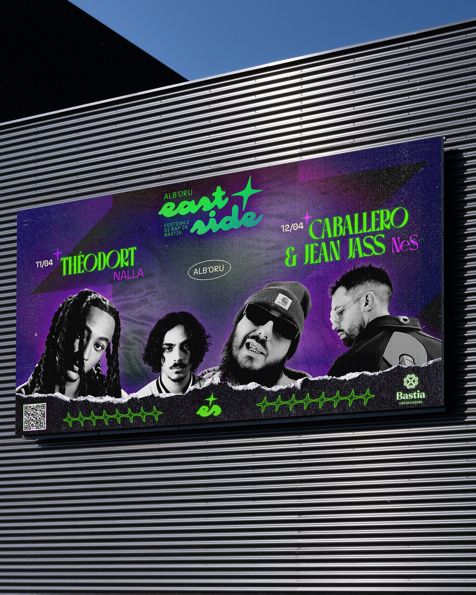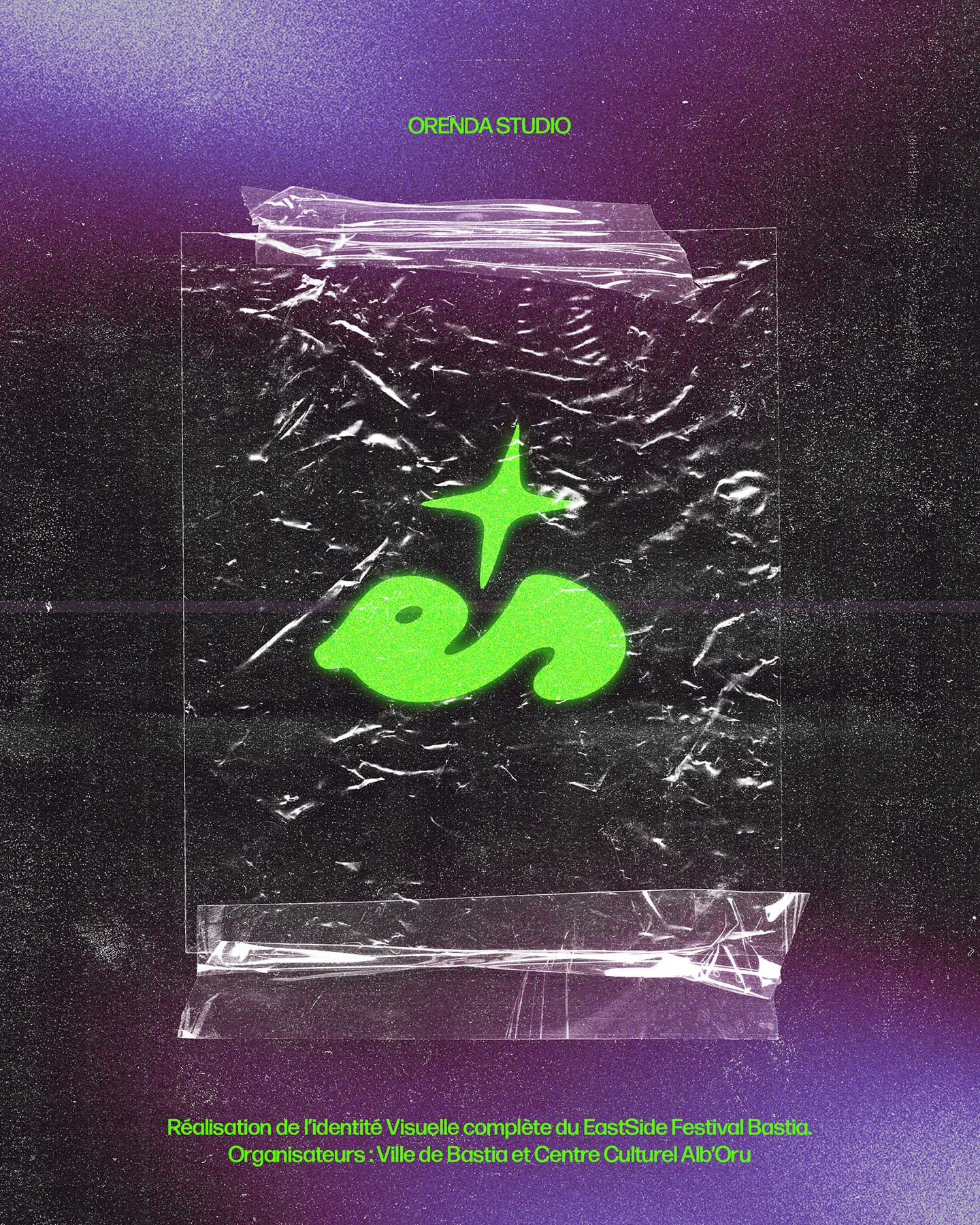 Le logo met en avant le nom EastSide, avec une typographie large évoquant le mouvement de la mer, mais étant à la fois inclusive. Elle permet de créer un contraste entre les identités urbaines dont on a l’habitude et le nom du festival, qui ramène à la position géographique de Bastia, et à la mer.